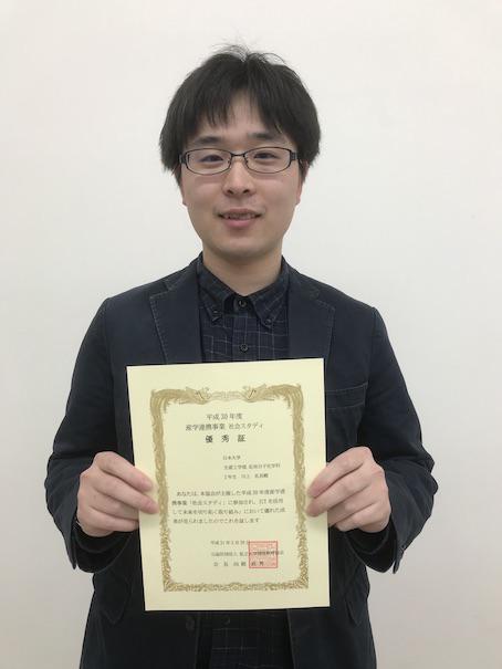 生産工学部学生FDなどでも活躍している応用分子化学科3年の川上礼吾君が,公益社団法人私立大学情報教育協会主催の平成30年度産学連携事業「社会スタディ」に参加し,学びの成果をまとめた成果報告書の内容が優れていたことから優秀証の評価を受けました。
