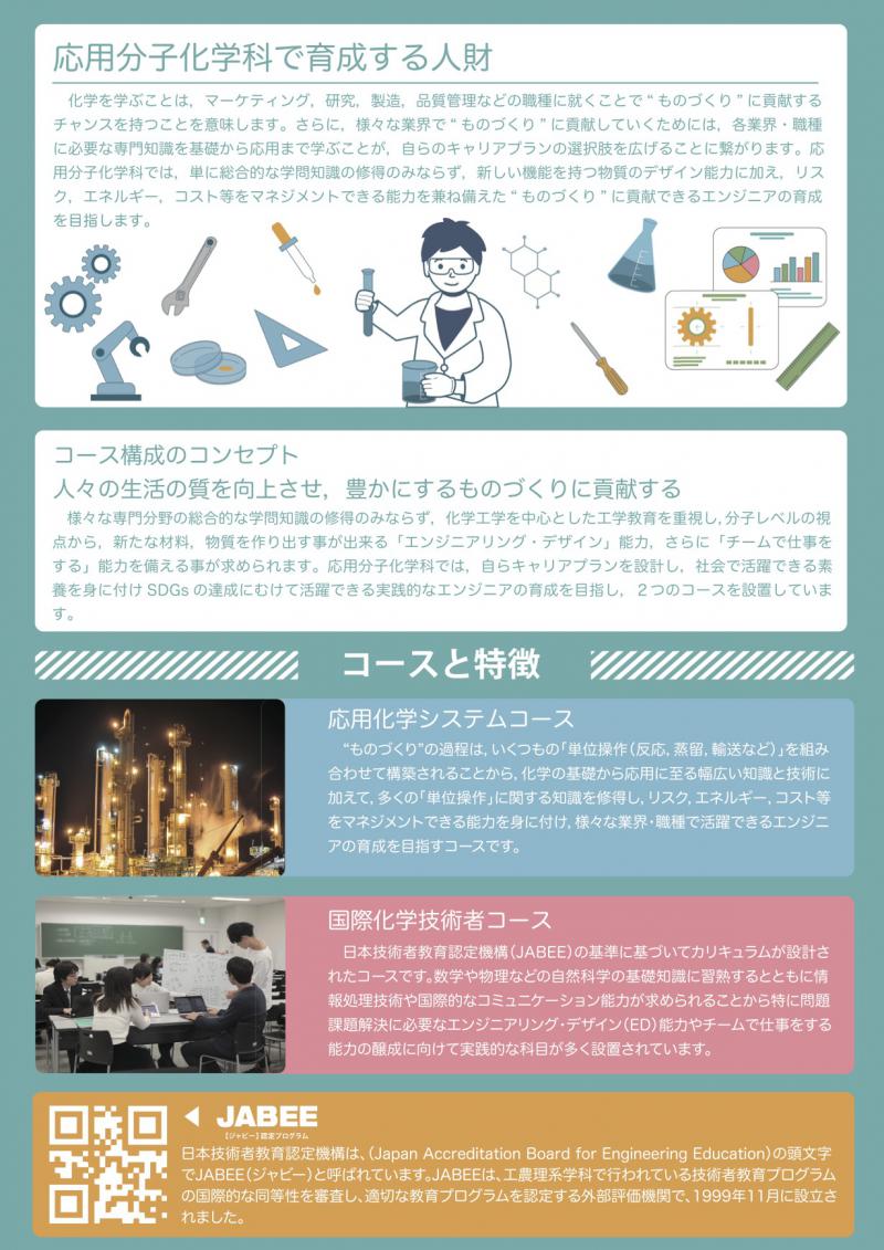 リスク,エネルギー,コスト等をマネジメントできる能力を身に付け,様々な業界・職種で活躍できるエンジニアの育成を目指す「応用化学システムコース」と,日本技術者教育認定機構(JABEE)に基づいてカリキュラムが設計された「国際化学技術者コース」です。