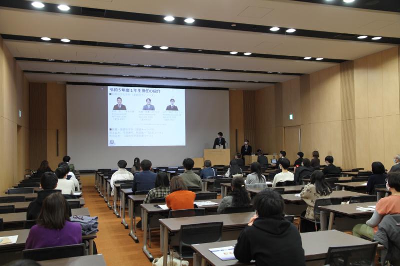 応用分子化学科主任の挨拶に始まり,参加者は入学してから卒業までの学業の流れと就職活動とキャリア教育についての説明を受けました。続いて,1年担任予定の教員から学生のサポート体制と校友会による支援について説明がありました。その後,参加者と同様の入試(指定校・総合型)で入学した先輩からの体験談を聞き,それぞれ入学してからの姿を想像してもらいました。
