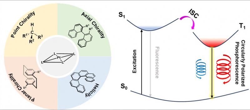 円偏光発光(CPL: Circularly Polarized Luminescence)とは、分子が左回転または右回転の偏りを持つ光を発する現象であり、光暗号通信や三次元表示技術、セキュリティー分野などへの応用が期待されています。本総説では、過去10年間に報告されているりん光性CPLを示す白金錯体を分類分けし、より高効率なCPLが発現する分子設計について議論しています。将来的にはこれらの材料が三次元有機ELディスプレイや次世代セキュリティー技術などへの実用化に繋がることが期待されます。