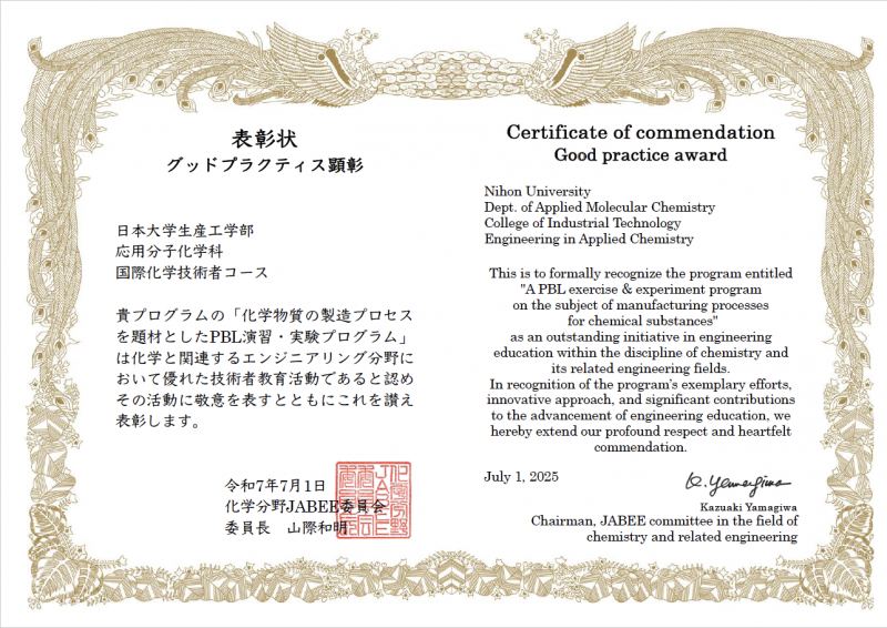 一般財団法人 日本技術者教育認定機構(JABEE) 化学分野JABEE委員会より、優れた技術者教育事例としてグッドプラクティス顕彰を受賞しました。 取り組み名: 「化学物質の製造プロセスを題材とした PBL 演習・実験プログラム」