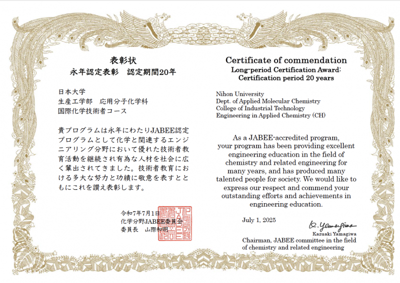 一般財団法人 日本技術者教育認定機構(JABEE) 化学分野JABEE委員会より、長年に渡って優れた技術者教育を実施しているプログラムとして「永年認定表彰 認定期間20年」を受賞しました。 本学科では、引き続き優れた技術者教育を継続していきます。