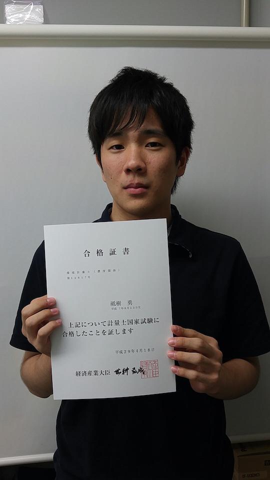 学部4年生(受験時学部3年)の祇樹 勇君が環境計量士(濃度関係)に合格